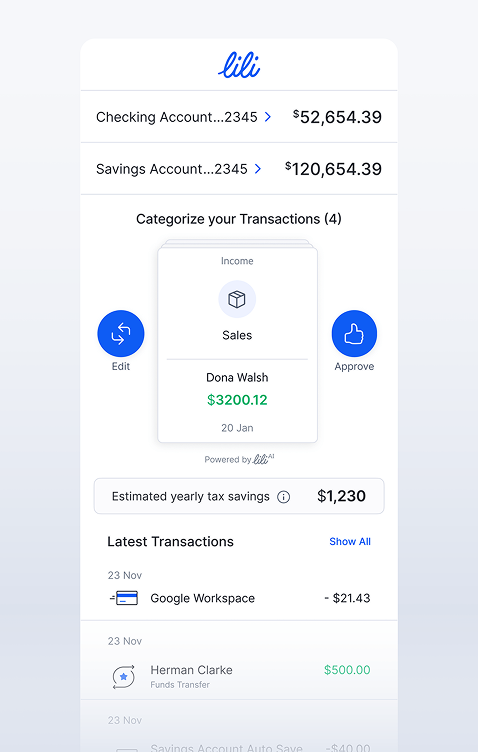 7 Lili AI and other reports related to income and expenses provided by Lili can be used to assist with your accounting. Final categorization of income and expenses for tax purposes is your responsibility. Lili is not a tax preparer and does not provide tax, legal or accounting advice. You should consult your own tax, legal and accounting advisors regarding your specific situation.