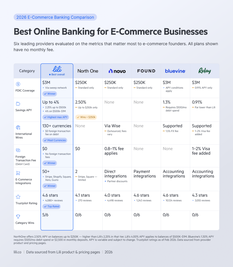 The Lili team selected the best business bank accounts for e-commerce businesses after evaluating a lineup of account providers according to a selection of key features. We considered FDIC insurance limits, account fees, transaction limits, support for international wire transfers, direct integration options, expedited domestic payments, interest yields, TrustPilot ratings and reviews, ATM networks, and more. The top picks each offer a business bank account plan with no monthly fee, have earned a TrustPilot rating above 4.0 stars, and have a competitive overall online offering with features that support e-commerce businesses.